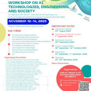 ขอเชิญเข้าร่วมงานประชุมวิชาการนานาชาติ The 1st International Workshop onAI Technologies, Engineering, and Society (AITES 2025)Co-organized with The 20th International Joint Symposium onArtificial Intelligence and Natural Language Processing (iSAI-NLP 2025)