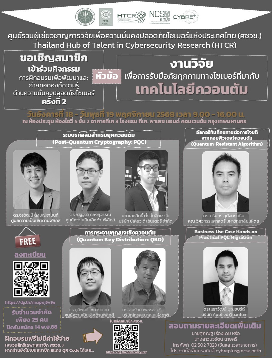 ศูนย์รวมผู้เชี่ยวชาญการวิจัยเพื่อความมั่นคงปลอดภัยไซเบอร์แห่งประเทศไทย (ศชวซ.) หรือ Thailand Hub of Talent in Cybersecurity Research (HTCR) แจ้งประชาสัมพันธ์สมาชิก ศชวซ. เชิญร่วมกิจกรรมการฝึกอบรมเพื่อพัฒนาและถ่ายทอดองค์ความรู้ ครั้งที่ 2 และกิจกรรม Research Networking