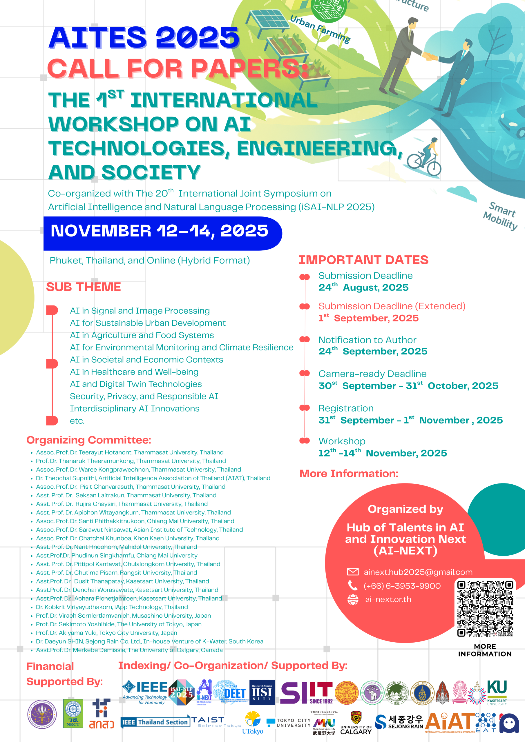 ขอเชิญเข้าร่วมงานประชุมวิชาการนานาชาติ The 1st International Workshop onAI Technologies, Engineering, and Society (AITES 2025)Co-organized with The 20th International Joint Symposium onArtificial Intelligence and Natural Language Processing (iSAI-NLP 2025)