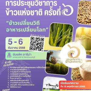 ขอเชิญร่วมงานประชุมวิชาการข้าวแห่งชาติ ครั้งที่ 6 🇹🇭 🌾ภายใต้หัวข้อ “ข้าวเปลี่ยนวิถี อาหารเปลี่ยนโลก” ขอเชิญร่วมงานประชุมวิชาการข้าวแห่งชาติ ครั้งที่ 6 🇹🇭 🌾ภ […] 05 - 06 ธ.ค. 08:00 - 16:00 ศูนย์แสดงสินค้าและการประชุม อิมแพ็ค เมืองทองธานี