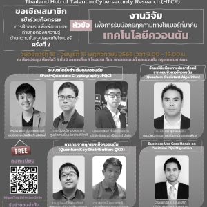 ศูนย์รวมผู้เชี่ยวชาญการวิจัยเพื่อความมั่นคงปลอดภัยไซเบอร์แห่งประเทศไทย (ศชวซ.) หรือ Thailand Hub of Talent in Cybersecurity Research (HTCR) แจ้งประชาสัมพันธ์สมาชิก ศชวซ. เชิญร่วมกิจกรรมการฝึกอบรมเพื่อพัฒนาและถ่ายทอดองค์ความรู้ ครั้งที่ 2 และกิจกรรม Research Networking ศูนย์รวมผู้เชี่ยวชาญการวิจัยเพื่อความมั่นคงปลอดภัยไซเบอ […] 18 - 19 พ.ย. 09:00 - 16:00 โรงแรม ทีเค. พาเลซ แอนด์ คอนเวนชั่น กรุงเทพมหานคร