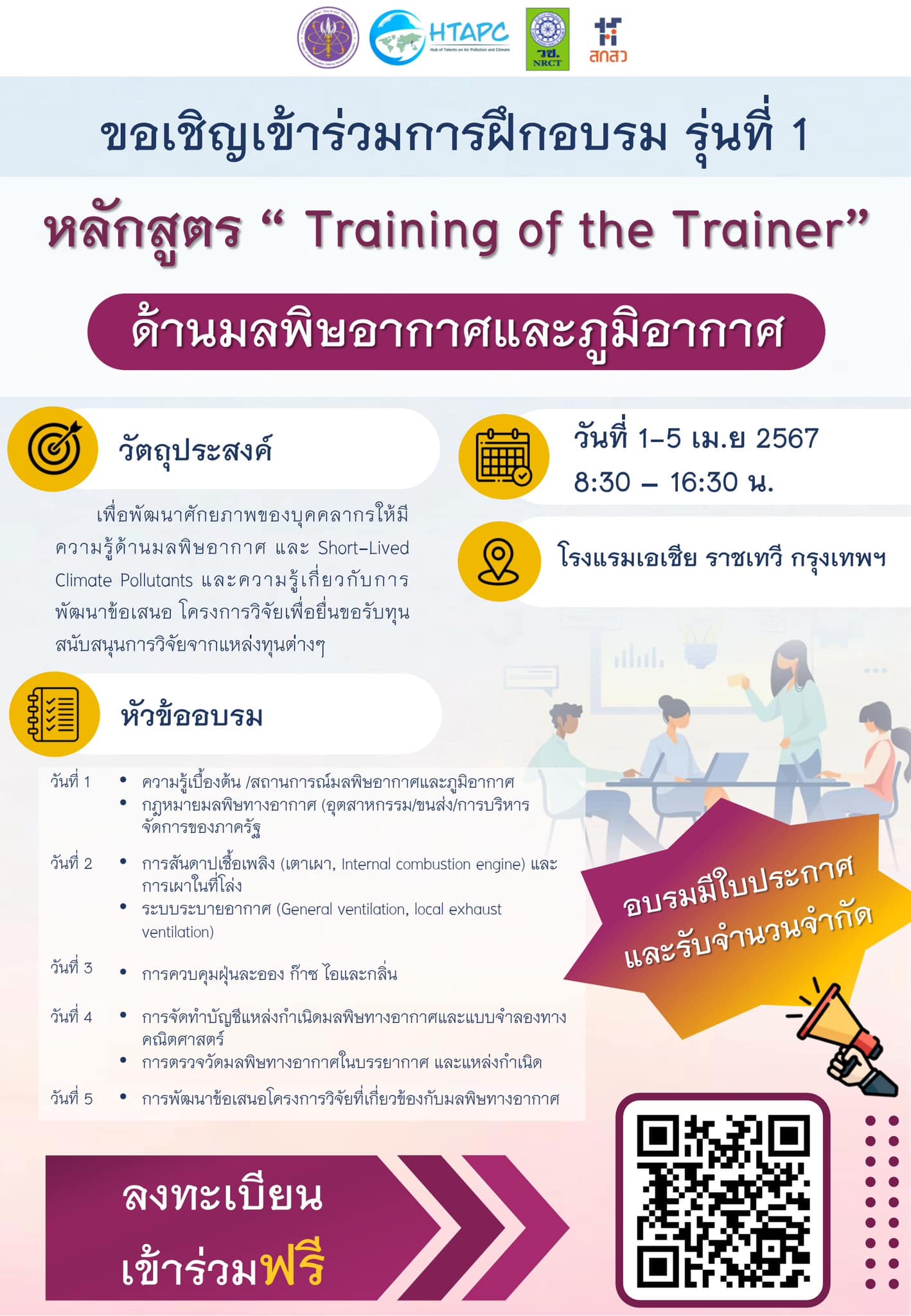 สำนักงานการวิจัยแห่งชาติ (วช.) กระทรวงการอุดมศึกษา วิทยาศาสตร์ วิจัยและนวัตกรรม โดยศูนย์รวมผู้เชี่ยวชาญด้านมลพิษอากาศและภูมิอากาศ จัดฝึกอบรม “Training of the Trainer” ด้านมลพิษอากาศและภูมิอากาศ เพื่อพัฒนาศักยภาพของบุคคลากรให้มีความรู้ด้านมลพิษทางอากาศ และ Short-Lived Climate Pollutants และความรู้เกี่ยวกับการพัฒนาข้อเสนอ โครงการวิจัยเพื่อยื่นขอรับทุนสนับสนุนการวิจัยจากแหล่งทุนต่าง ๆ