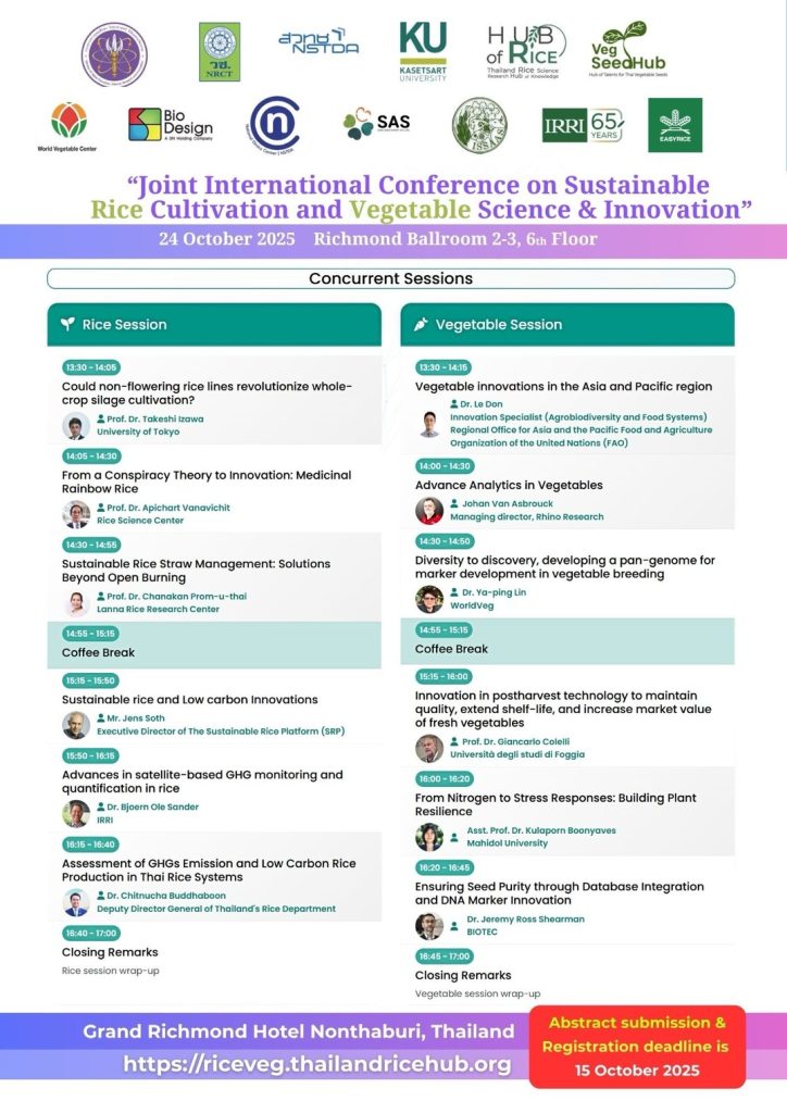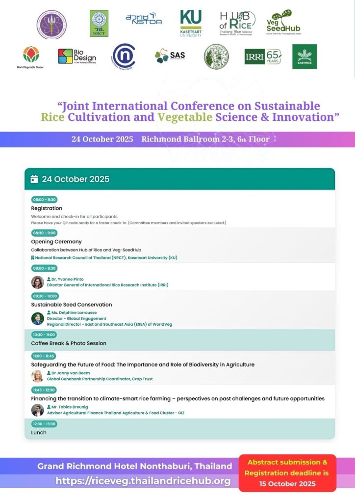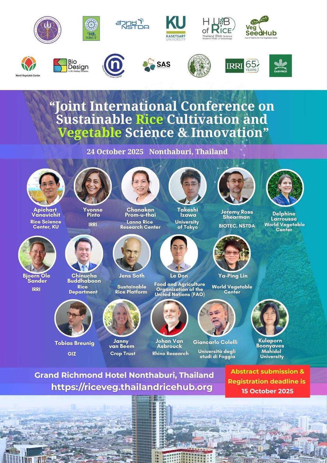 This international conference is co-organized by the Thailand Rice Science Research Hub of Knowledge (Hub of Rice) and the Hub of Talents for Thai Vegetable Seeds (Veg-SeedHub), both supported by the National Research Council of Thailand (NRCT). With strong collaboration from Kasetsart University, NSTDA, and the World Vegetable Center, the event will showcase cutting-edge research, highlight innovations, and foster cross-crop learning to strengthen agricultural development.