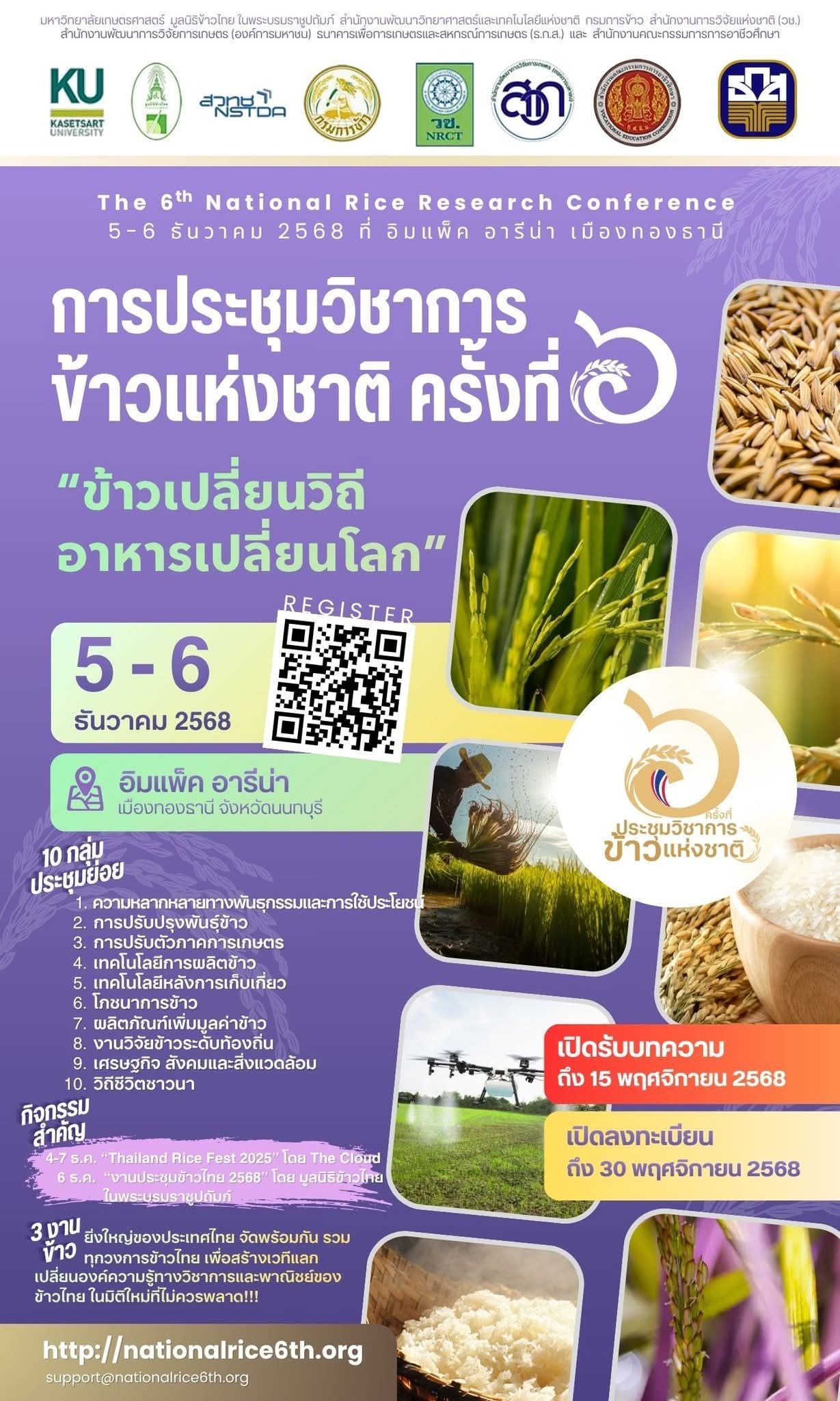 ขอเชิญร่วมงานประชุมวิชาการข้าวแห่งชาติ ครั้งที่ 6 🇹🇭 🌾ภายใต้หัวข้อ “ข้าวเปลี่ยนวิถี อาหารเปลี่ยนโลก”