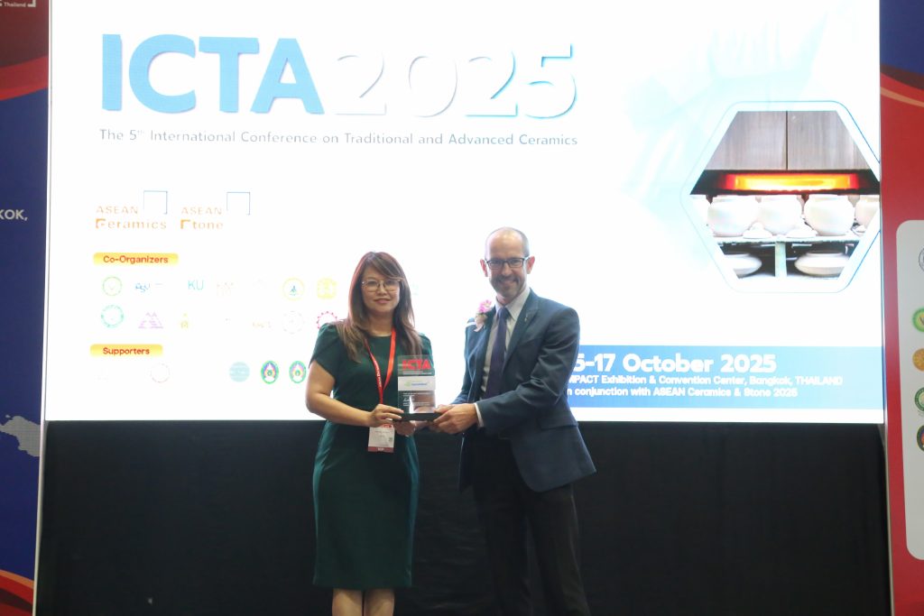 ศูนย์รวมผู้เชี่ยวชาญวัสดุยั่งยืนเพื่อเศรษฐกิจหมุนเวียน ภายใต้สำนักงานการวิจัยแห่งชาติ ร่วมจัดประชุม “The International Conference on Traditional and Advanced Ceramics (ICTA 2025)” ระหว่างวันที่ 15–17 ตุลาคม 2568 ณ ศูนย์แสดงสินค้าและการประชุมอิมแพ็ก เมืองทองธานี กรุงเทพฯ สำหรับพิธีเปิดมีนายสุรพล ปลื้มใจ รองอธิบดีกรมส่งเสริมอุตสาหกรรม กระทรวงอุตสาหกรรม เป็นประธาน โดยมีศาสตราจารย์ ดร.หทัยกานต์ มนัสปิยะ หัวหน้าศูนย์รวมผู้เชี่ยวชาญวัสดุยั่งยืนฯ เข้าร่วมพิธีและรับมอบโล่ผู้สนับสนุนการประชุม