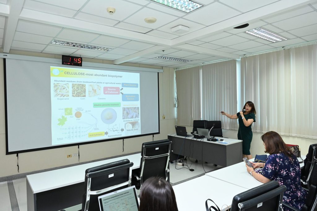 ในการประชุมหัวข้อ Bio-Based Materials ศาสตราจารย์ ดร.หทัยกานต์ มนัสปิยะ หัวหน้าศูนย์รวมผู้เชี่ยวชาญวัสดุยั่งยืนฯ ได้นำเสนอผลงานเรื่อง “From Nature to Nanotech: Unlocking the Potential of Bacterial Cellulose” เกี่ยวกับการประยุกต์นาโนเทคโนโลยีในการยกระดับวัสดุจากธรรมชาติให้กลายเป็นวัสดุมูลค่าสูง ซึ่งเป็นนวัตกรรมที่ช่วยขับเคลื่อนเศรษฐกิจหมุนเวียน